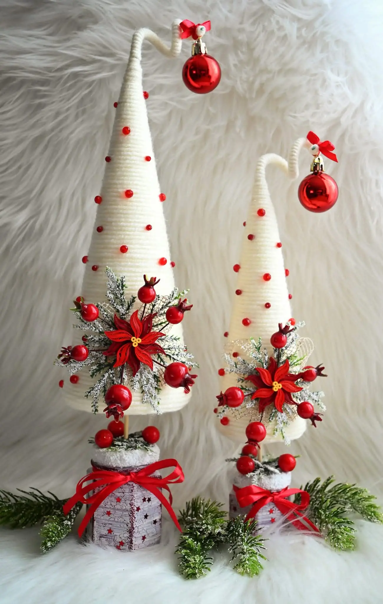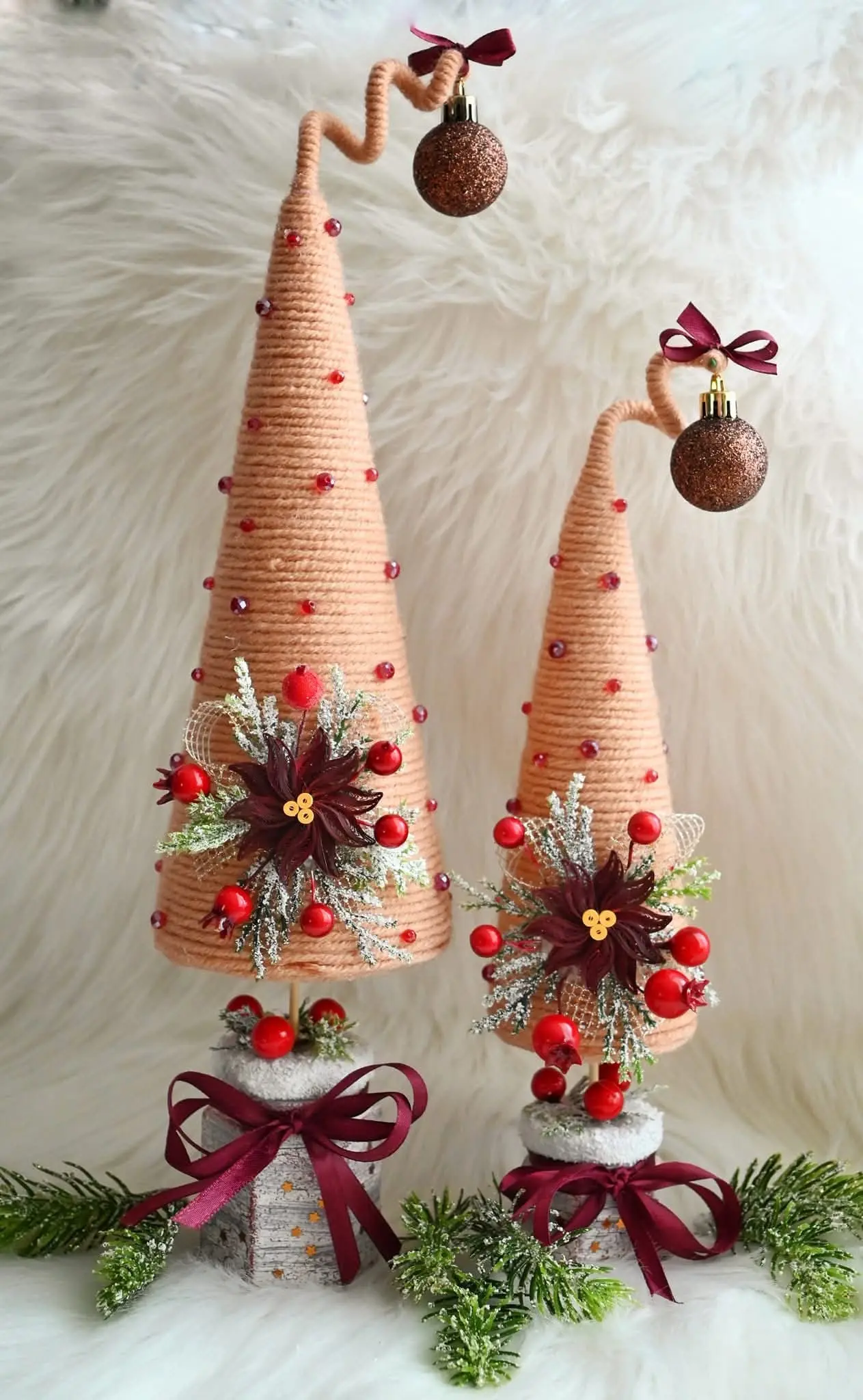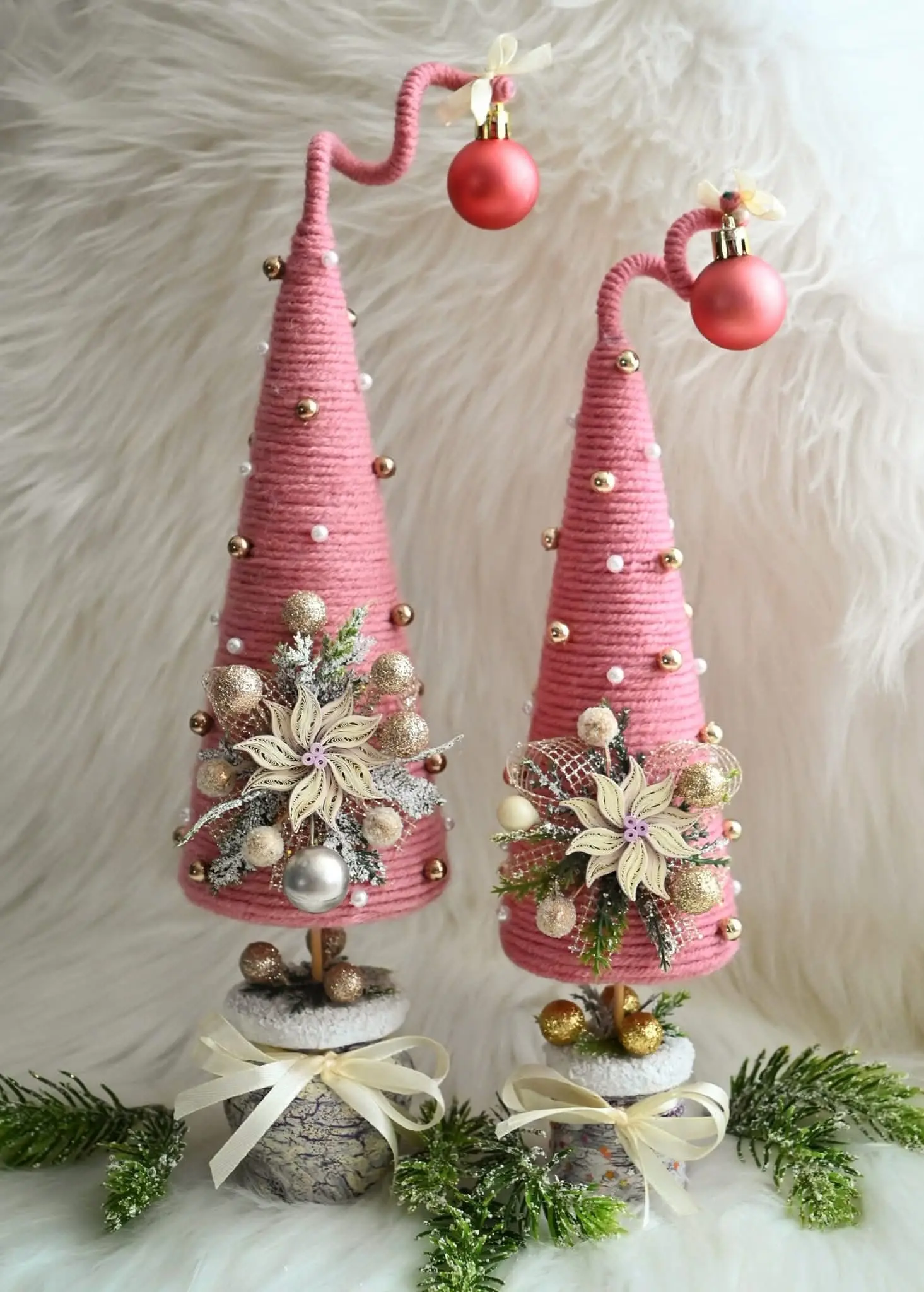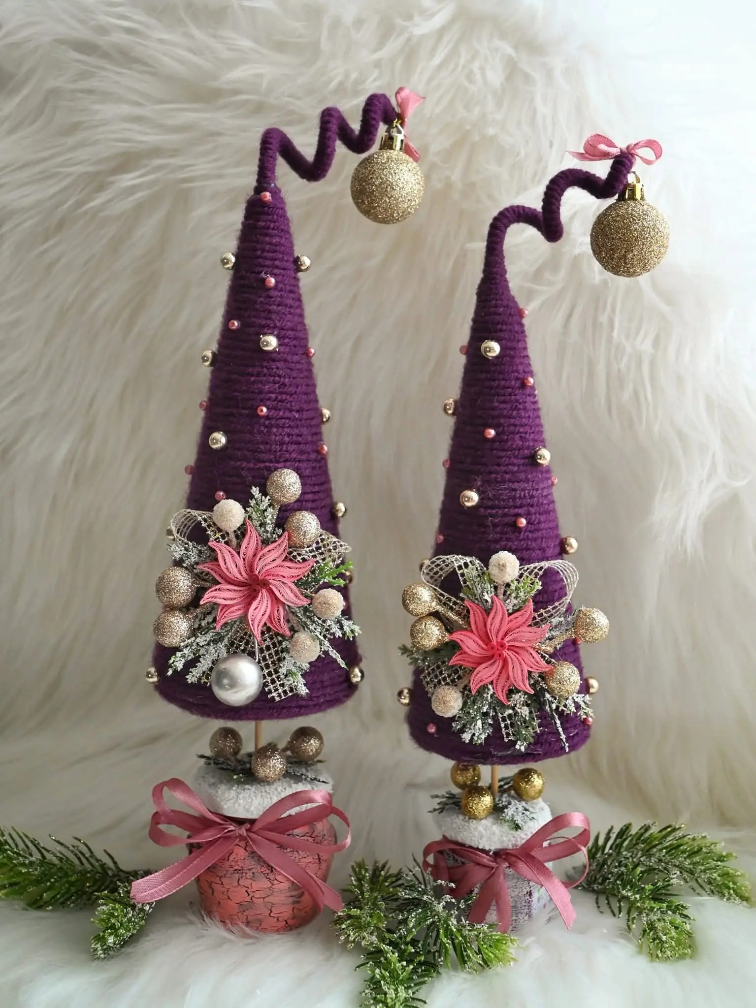 Brăduț de Craciun realizat manual din poliester sub formă de con, ață colorată, decorat cu Crăciuniță din hârtie quilling.