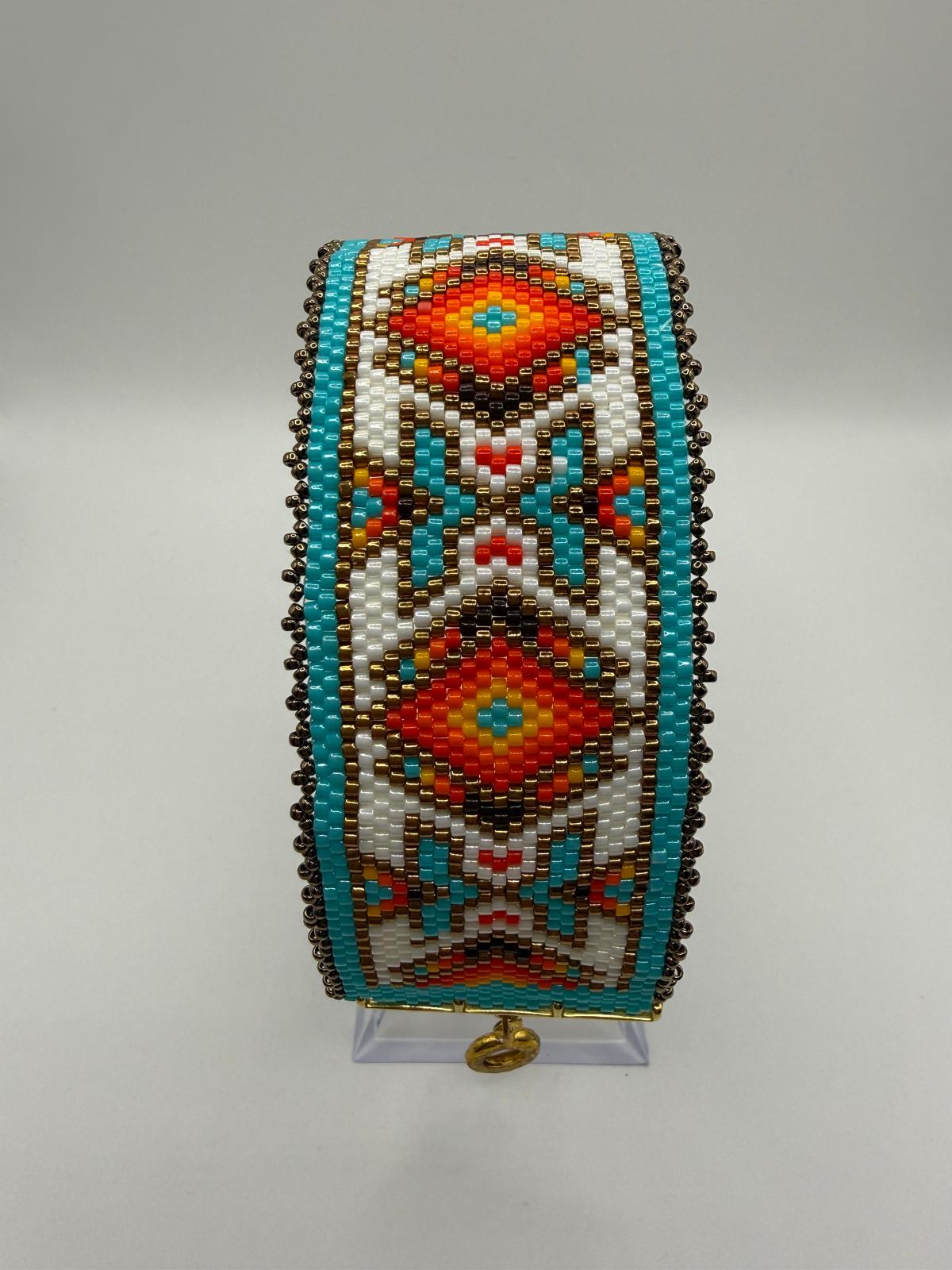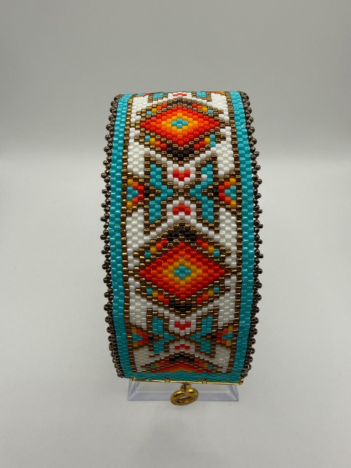 Inspirată din motivele etnice și energia culorilor deșertului, această brățară handmade este o explozie de culoare și stil. Realizată manual cu mărgele japoneze de înaltă precizie, combină armonios turcoazul vibrant, portocaliul aprins, roșul intens și accentele aurii într-un model geometric spectaculos.