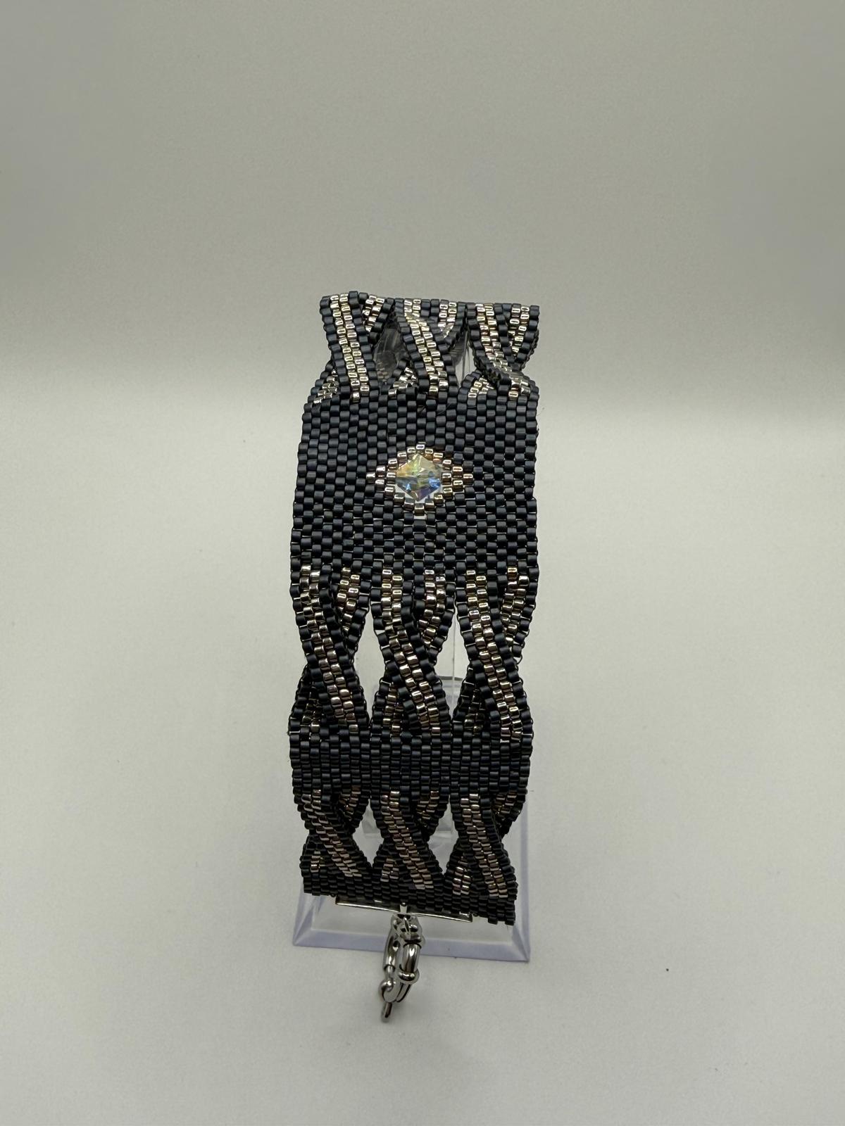 Brățara „Noir Éclat” – lucrată manual din mărgele Miyuki în nuanțe de negru și auriu, cu un cristal central care captează lumina. Un accesoriu sofisticat, creat pentru eleganță și rafinament. 🖤