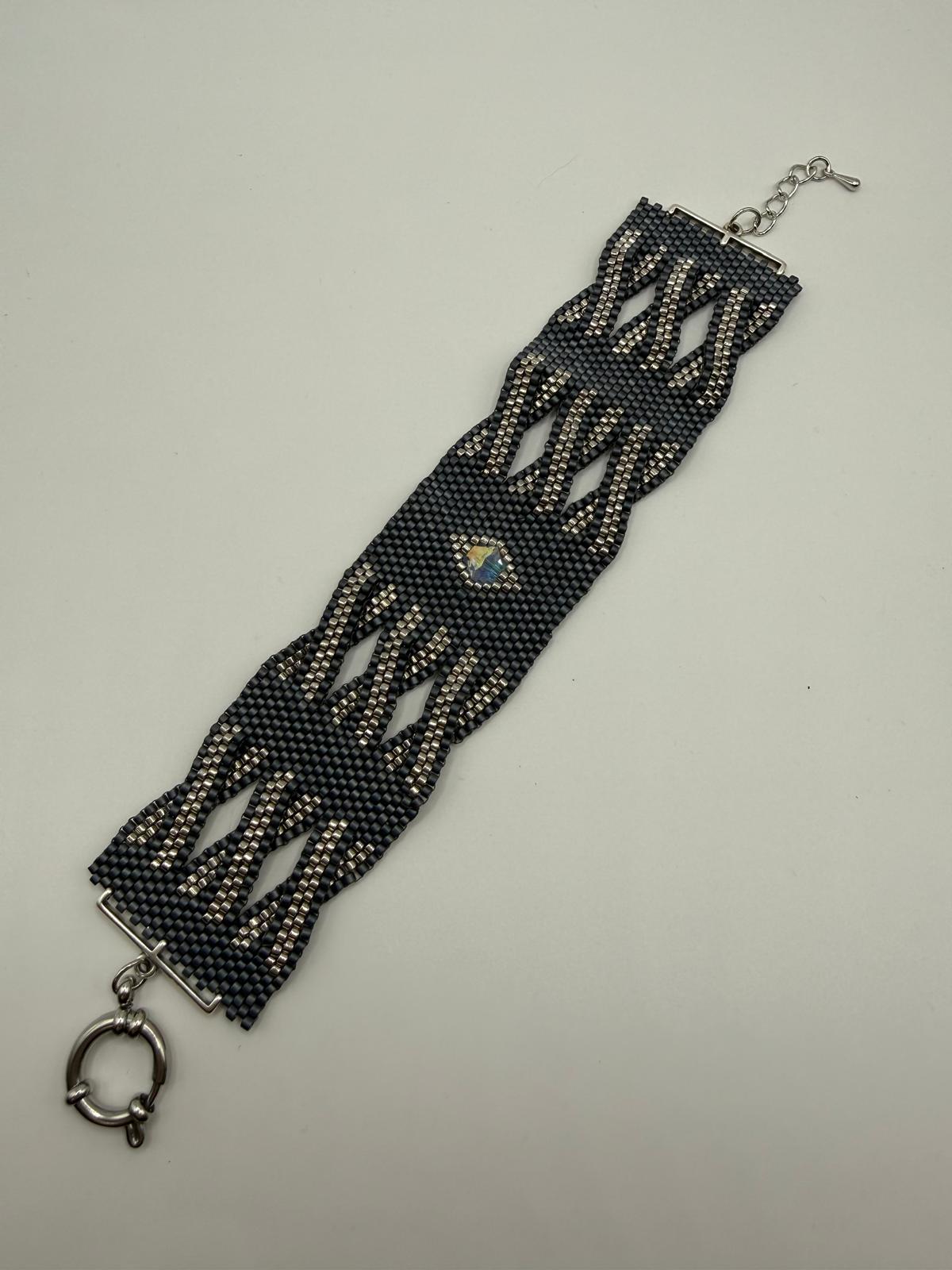 Lucrată manual din mărgele japoneze Miyuki Delica, recunoscute pentru uniformitatea și strălucirea lor discretă, brățara îmbină nuanțele profunde de negru mat cu accente metalice aurii, într-un joc elegant de texturi.