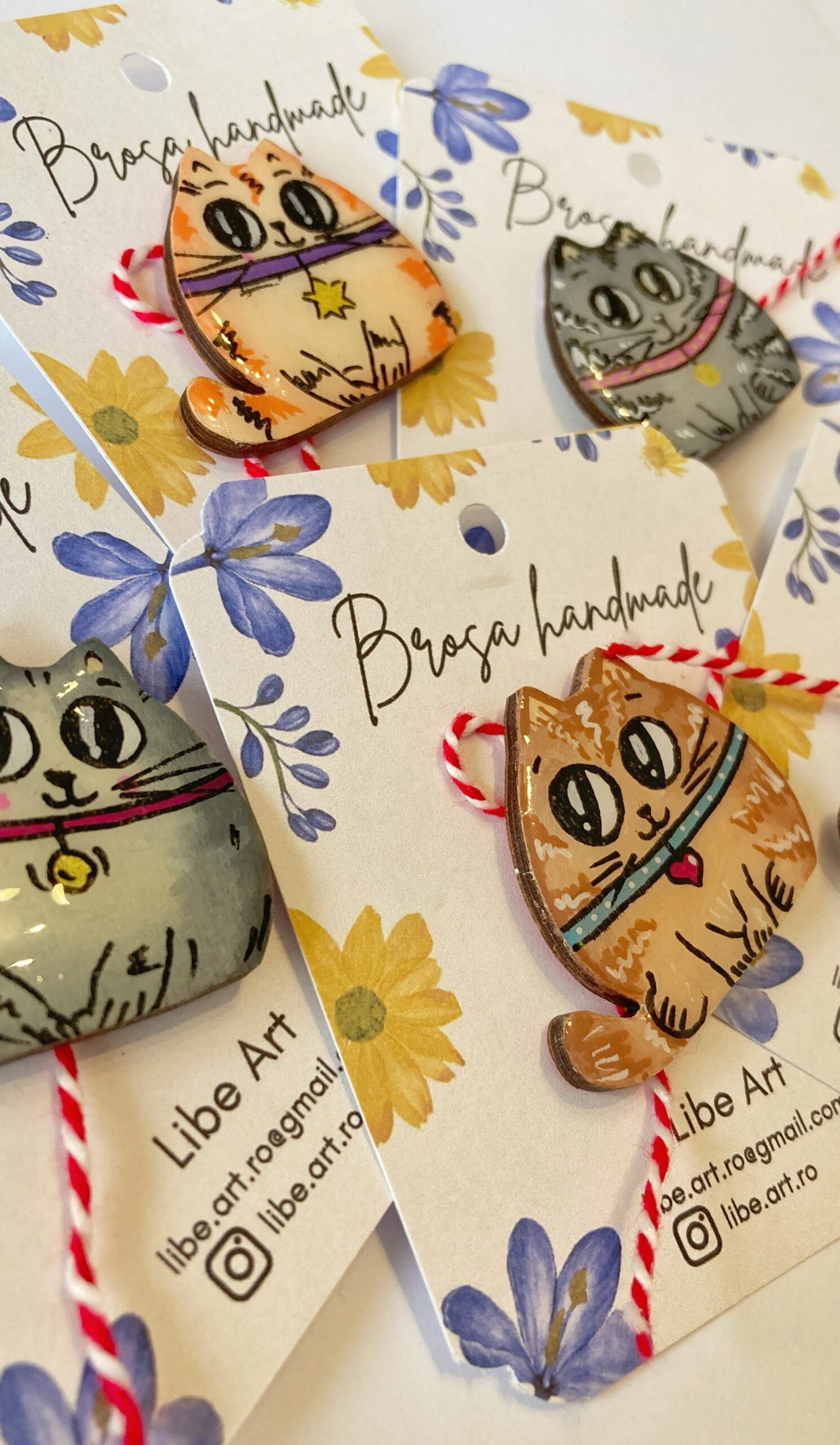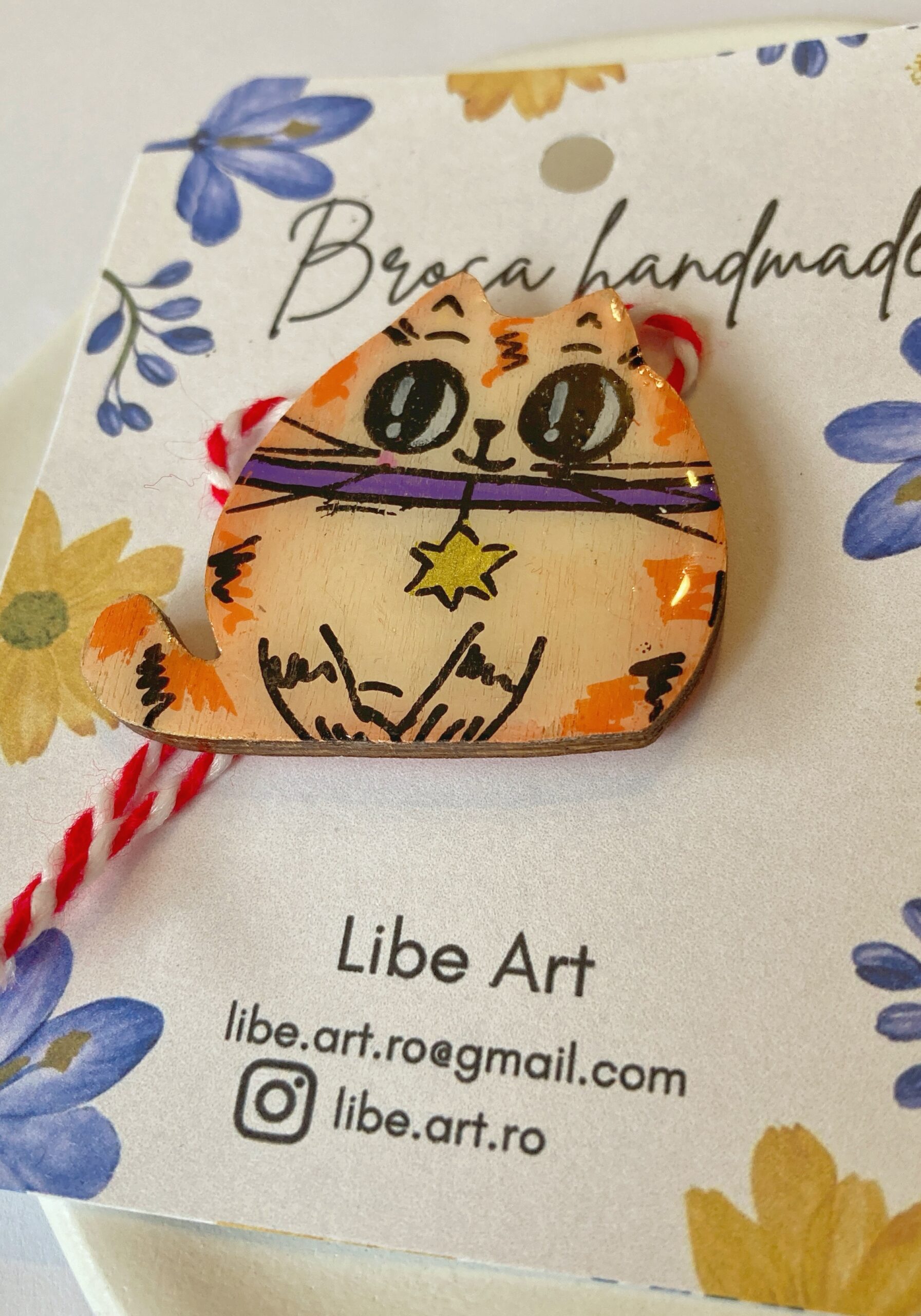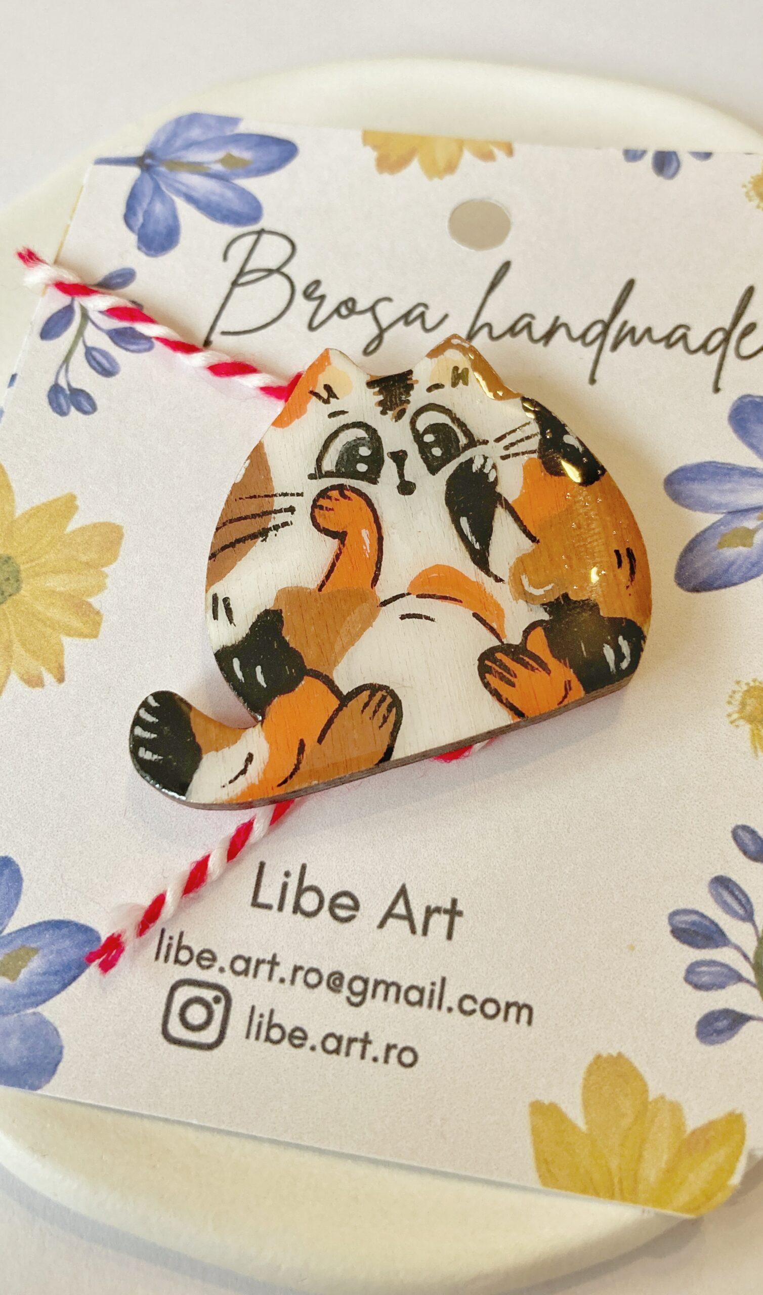 Brosă handmade în formă de pisica, realizată și pictată manual în nuanțe vibrante.