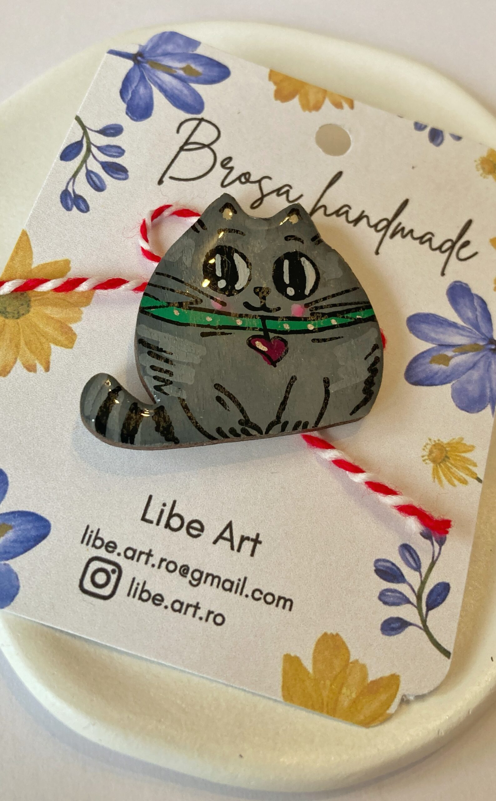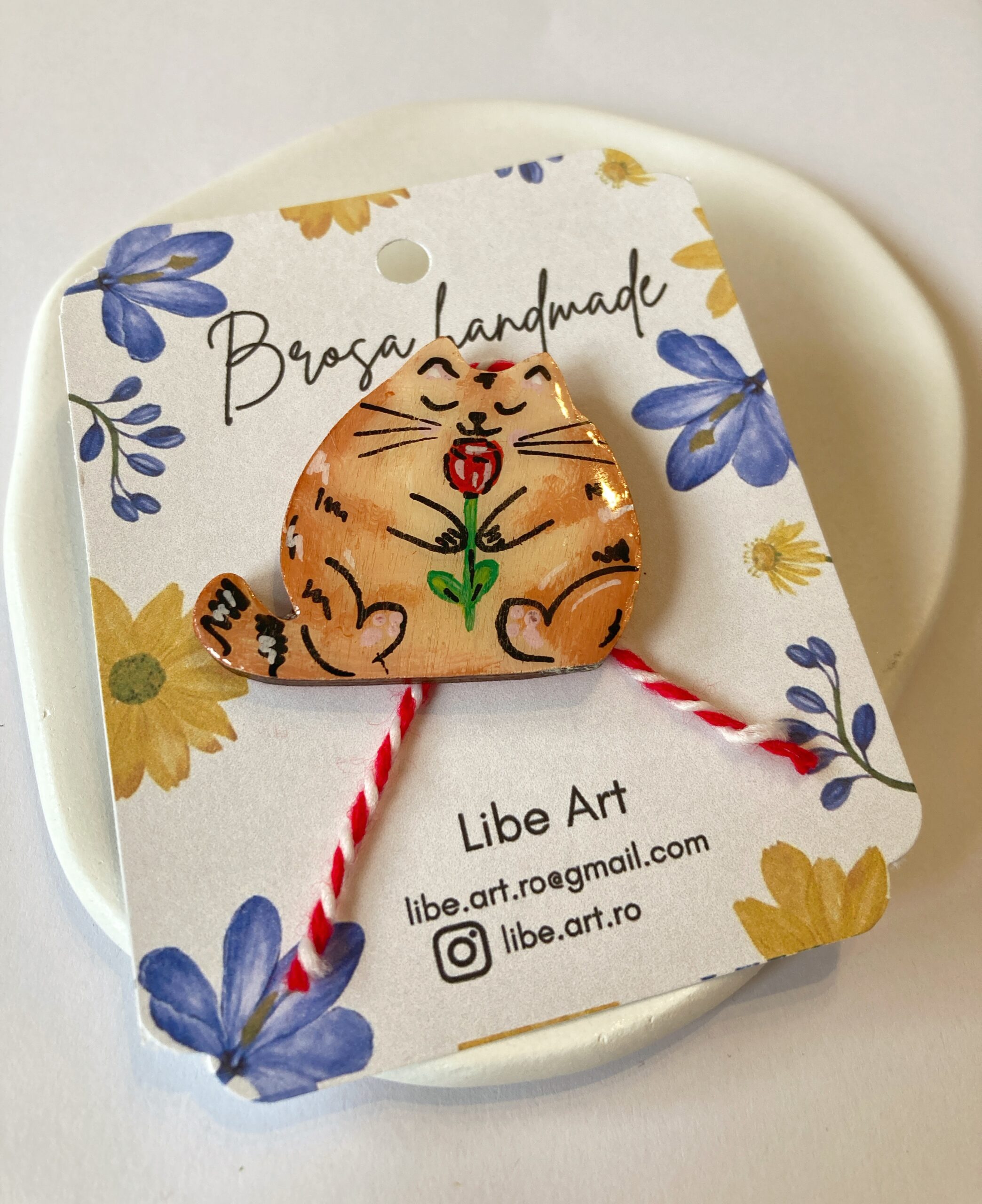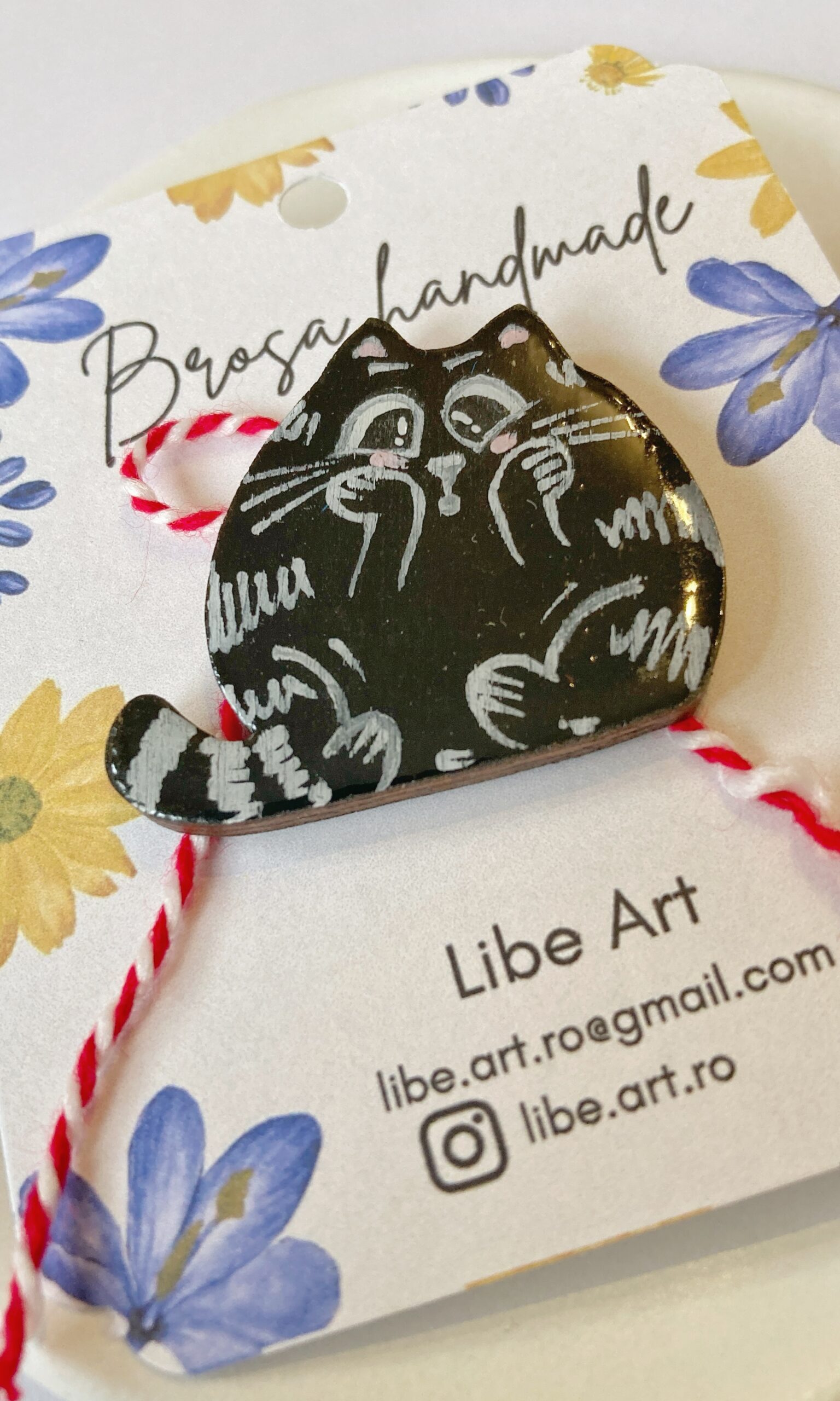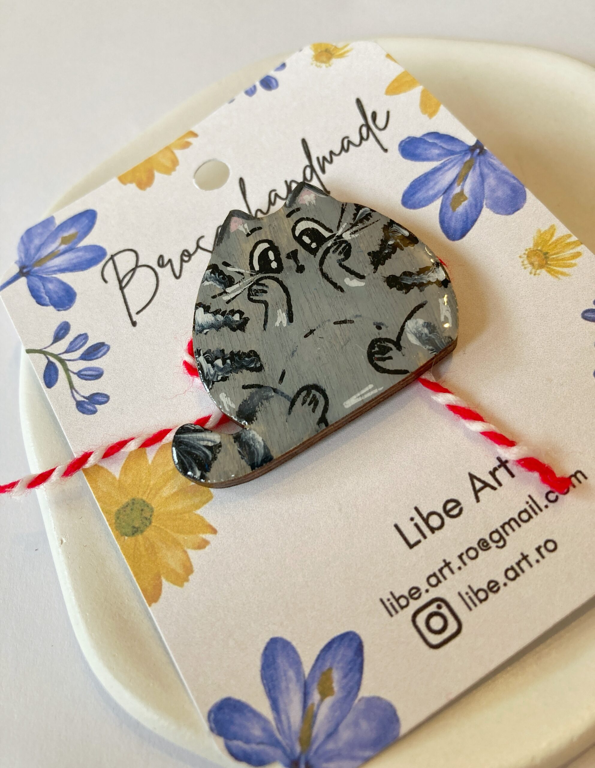 Brosă handmade în formă de pisica, realizată și pictată manual în nuanțe vibrante.