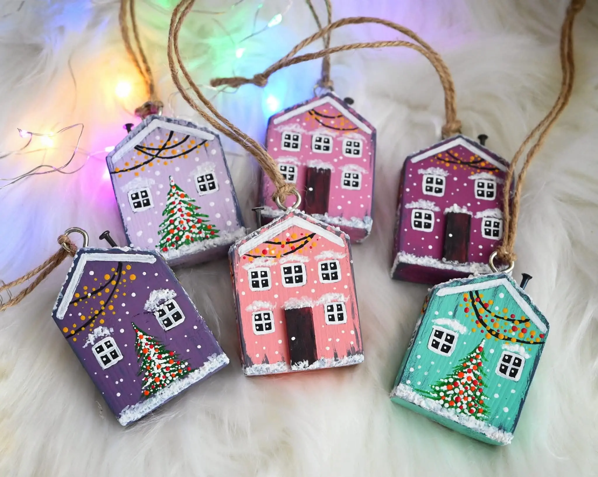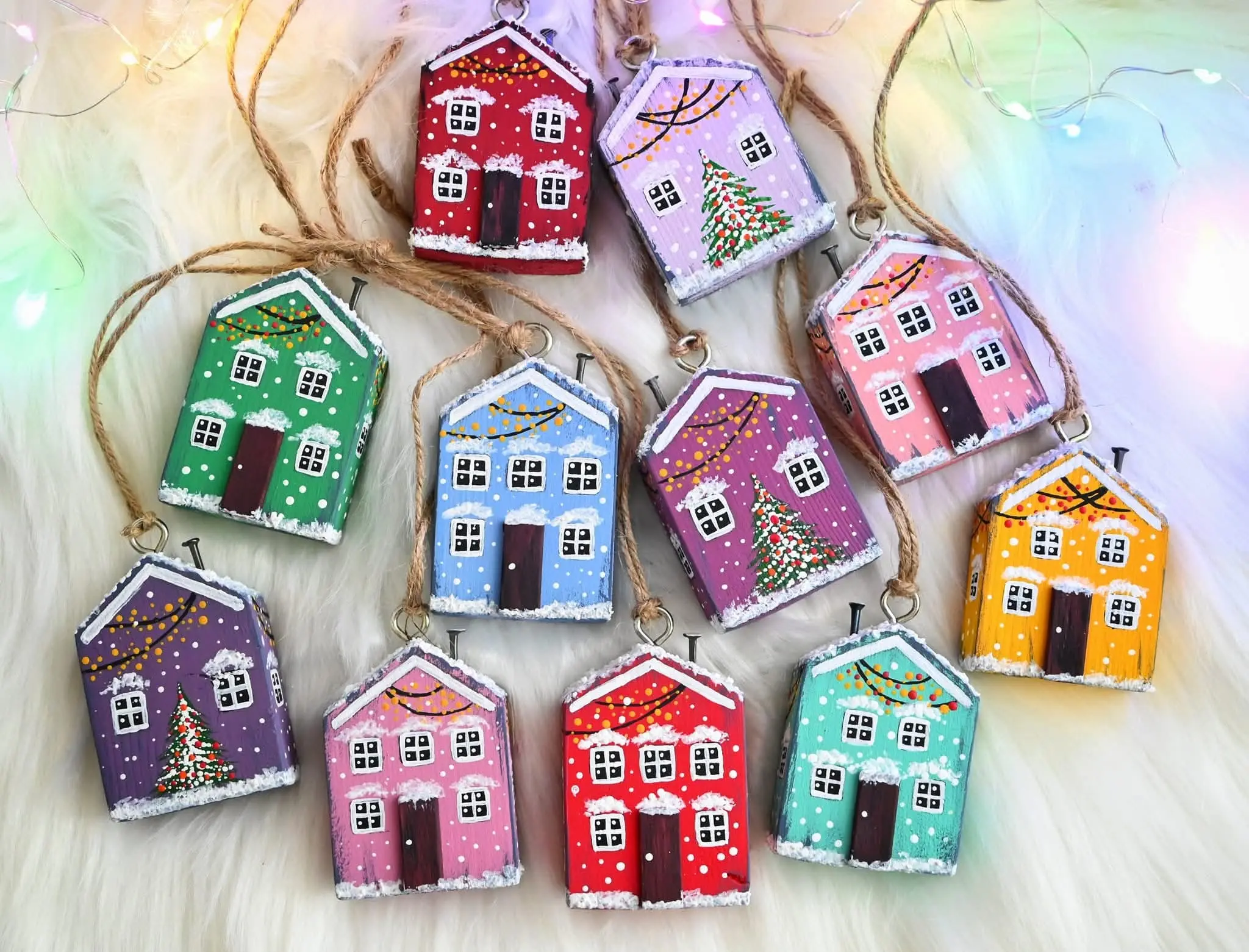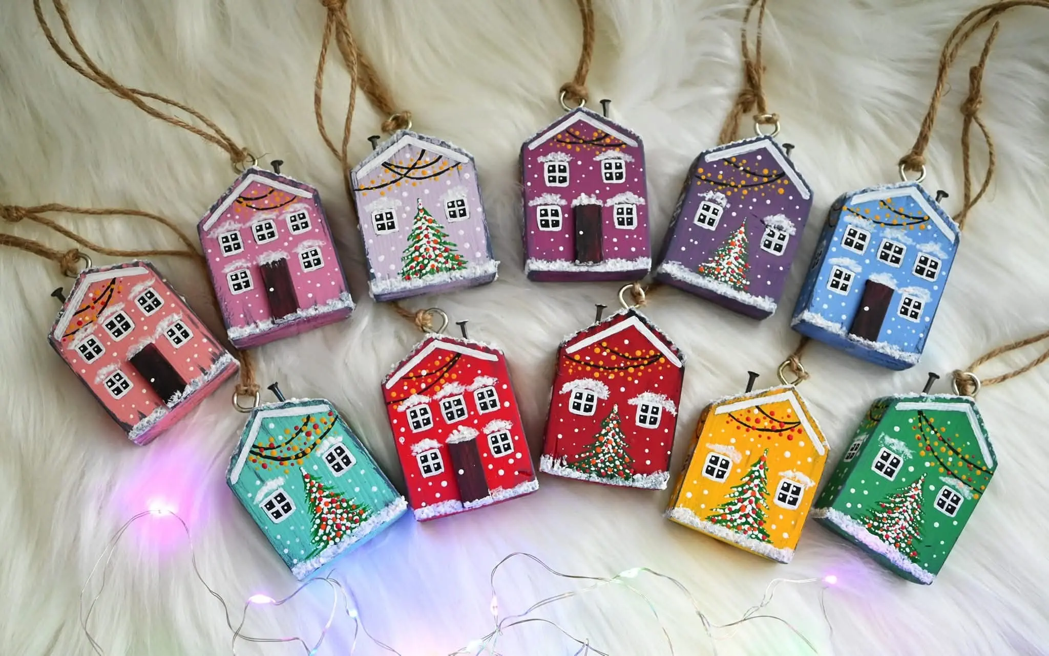 Căsuța pentru bradul de Crăciun este realizată manual din lemn, apoi este tăiată, șlefuită, vopsită, pictată și lăcuită.