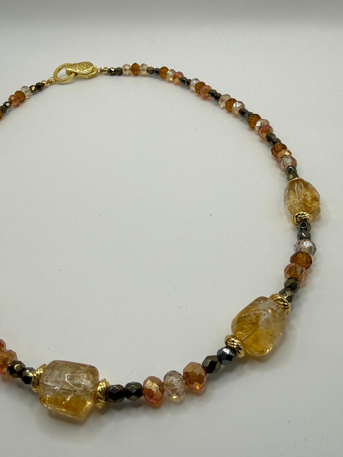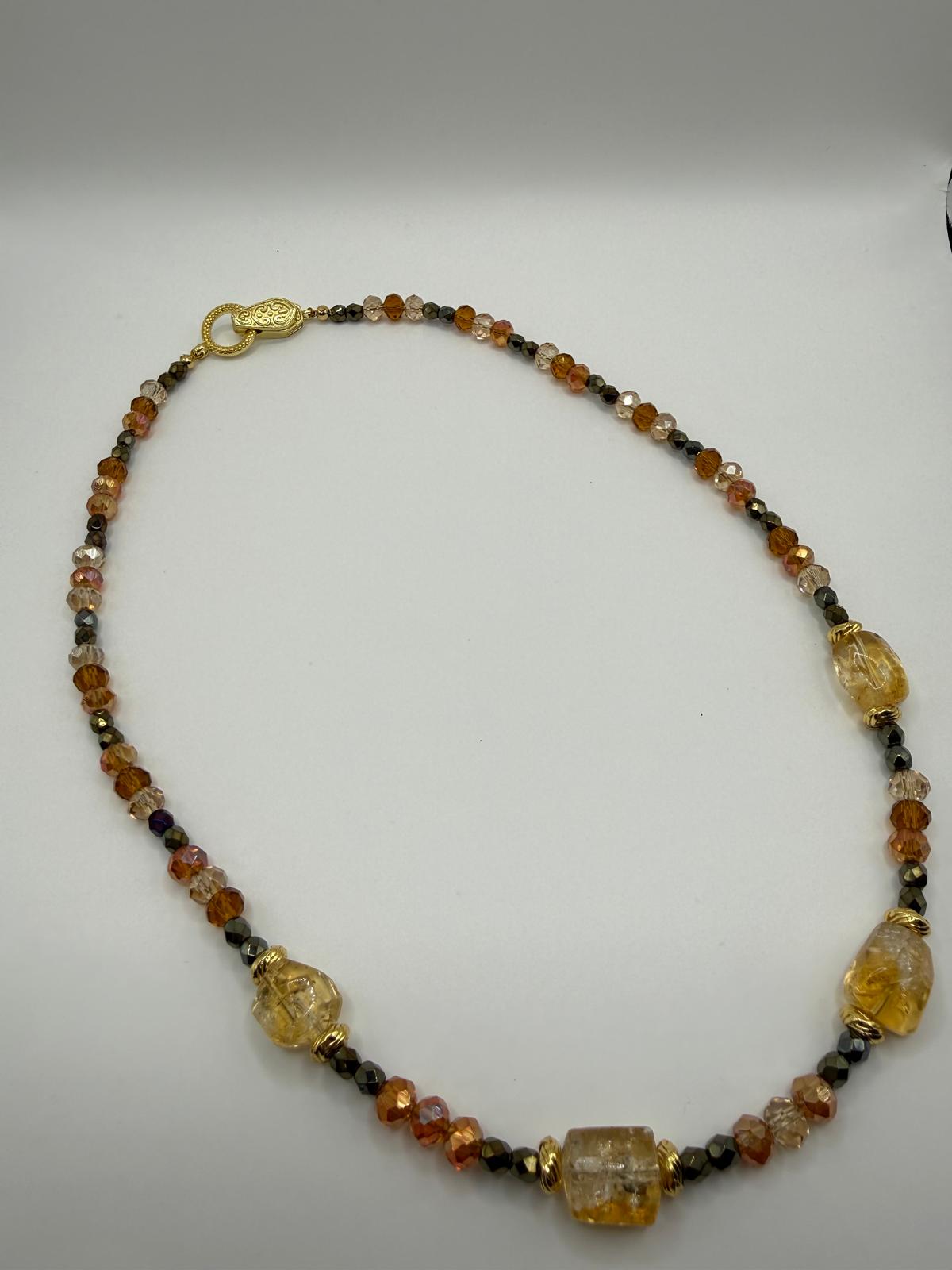 Acest colier handmade este o piesă rafinată, realizată manual din mărgele semiprețioase și cristale fațetate în nuanțe calde de chihlimbar, bronz și auriu. Combinația armonioasă dintre transparențele luminoase și reflexiile metalice creează un efect elegant și sofisticat, potrivit atât pentru ținutele de zi, cât și pentru cele de seară.