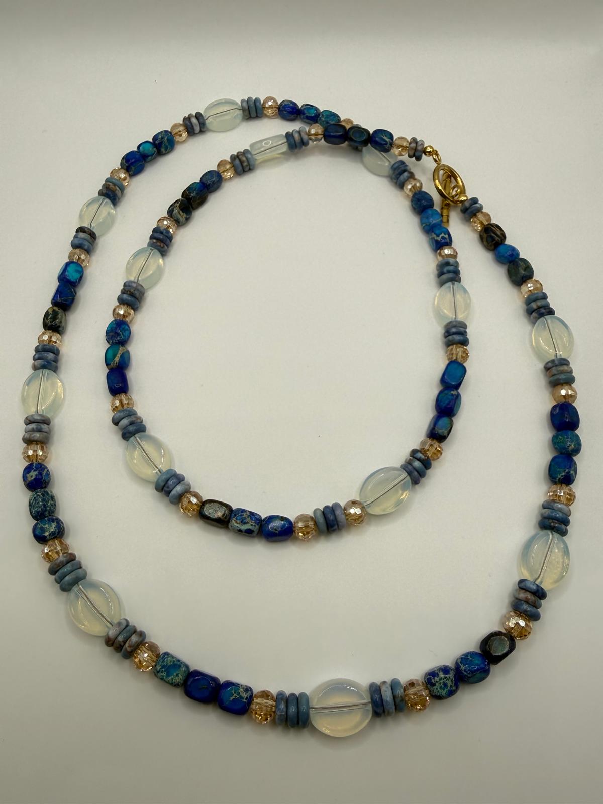 Acest colier handmade combină frumusețea naturală a tonurilor de albastru cu luminozitatea perlată a mărgelelor sidefate, amintind de valurile mării și cerul senin de vară.