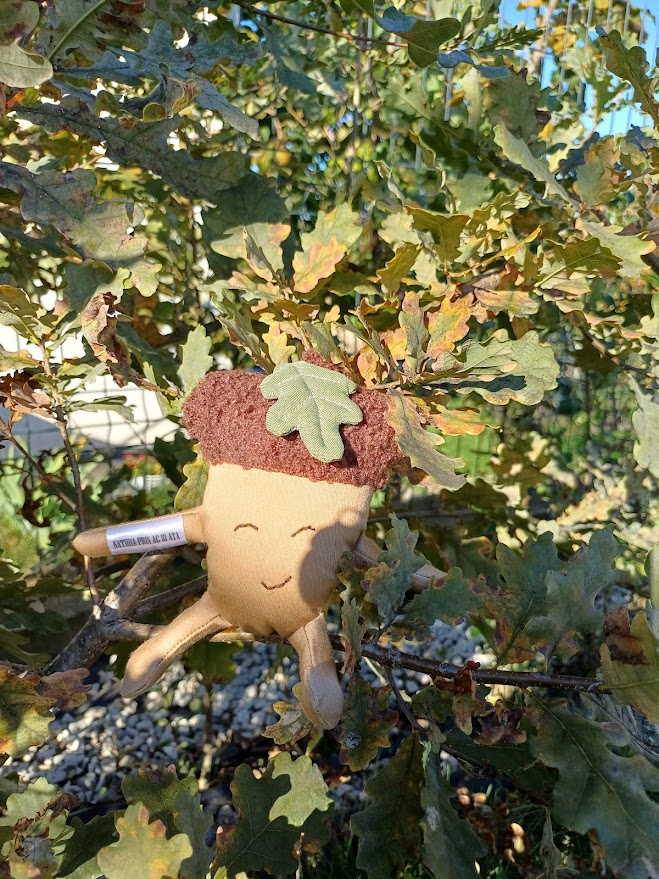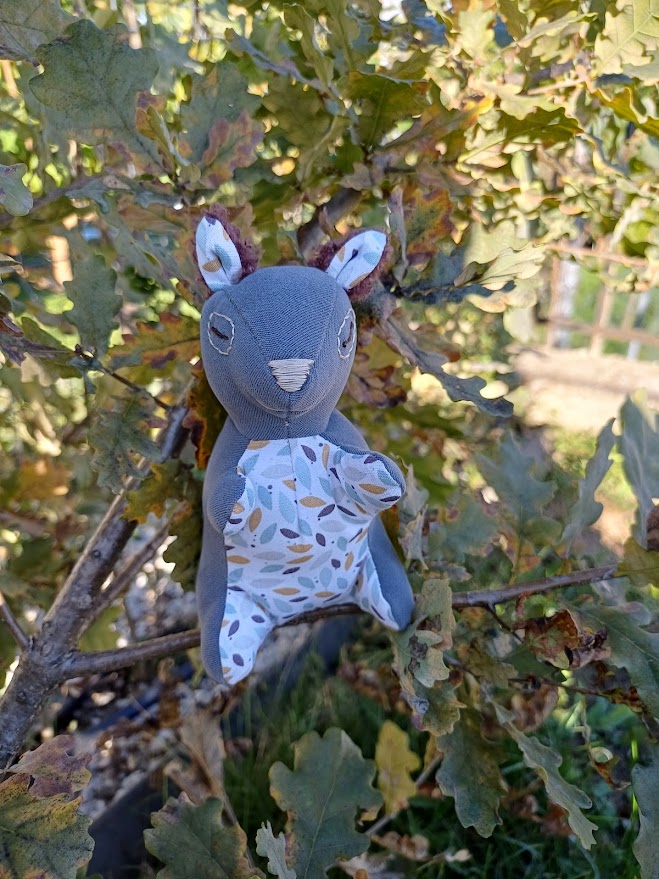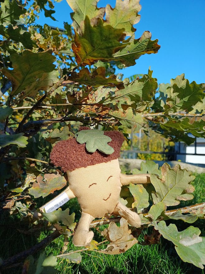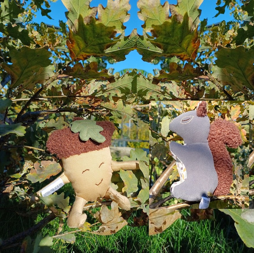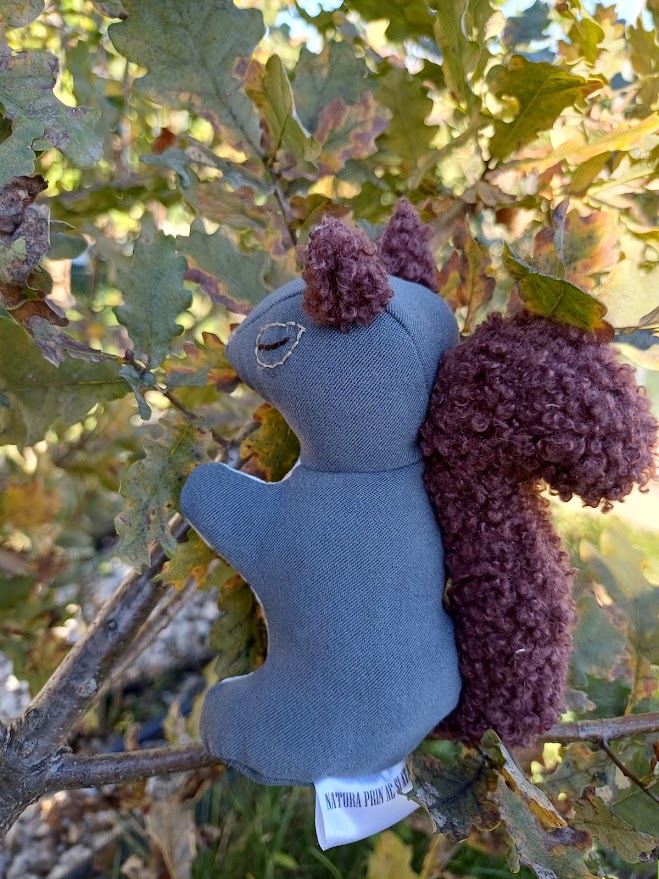 Ghindă și veveriță din materiale certificate Oeko-Tex – jucărie textilă handmade pentru copii.