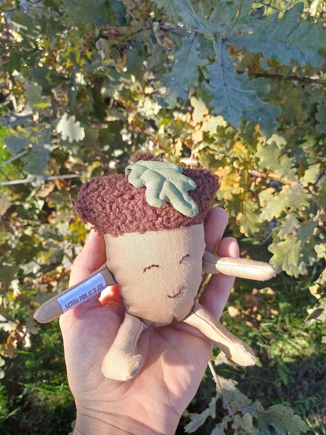 Compoziție: Strat exterior: 100% bumbac, cu certificare Oeko-Tex. Umplutură: 100% poliester, cu certificare Oeko-Tex. Dimensiuni: ghindă 14 x 16 x 7 cm / veverița 11 x 14 x 7 cm Greutate: ghindă / veverița 28 grame Ghindă realizată folosind un tipar de la Natura Prin Ac și Ață. Veveriță realizată folosind un tipar de la Efi Little Things.