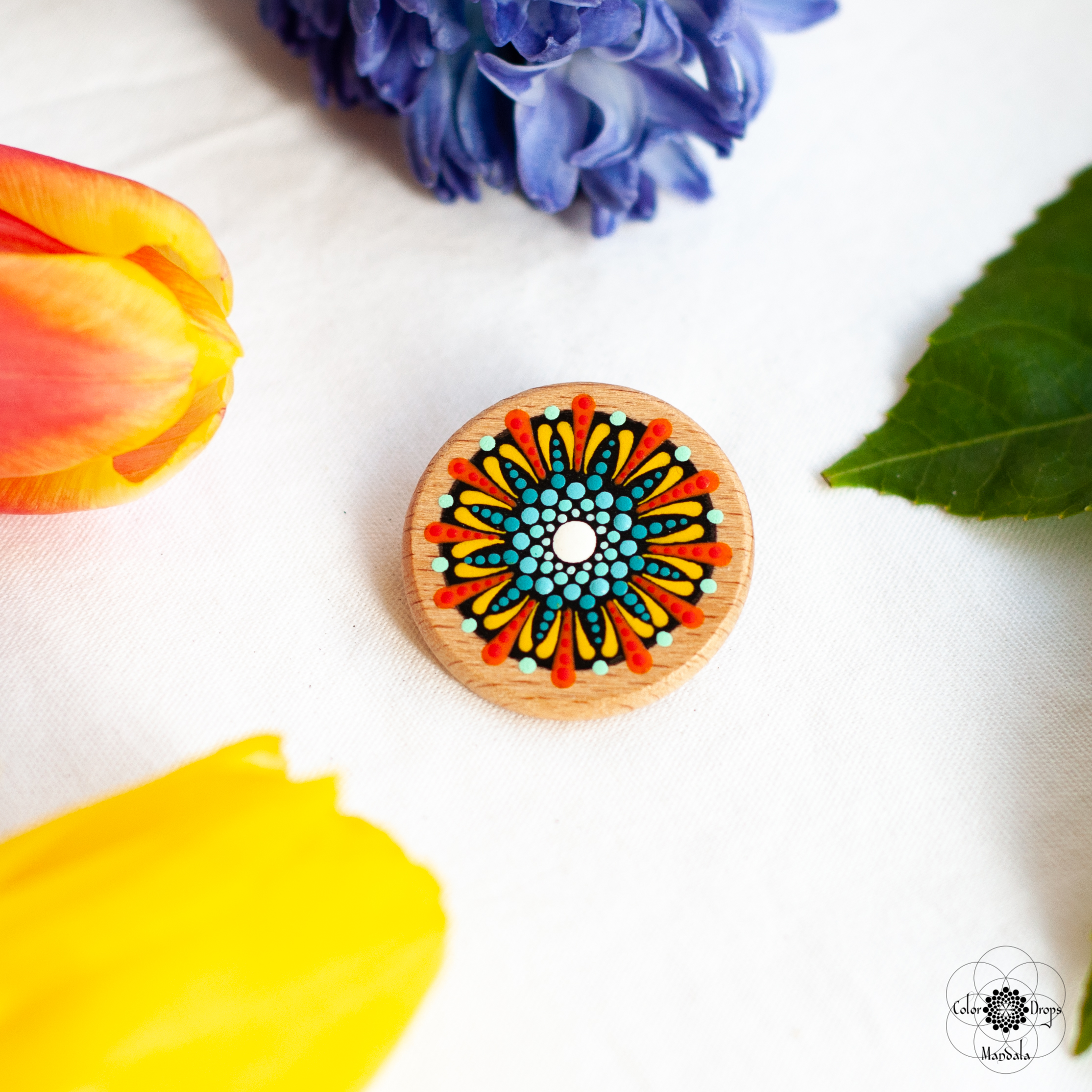 - Broșă Mandala, cu model floral, realizată din lemn și pictată manual cu culori acrilice pe bază de apă. Produsul este lăcuit cu două straturi de vernis mat, non-toxic, rezistent la apă, ce îi oferă o rezistență sporită.